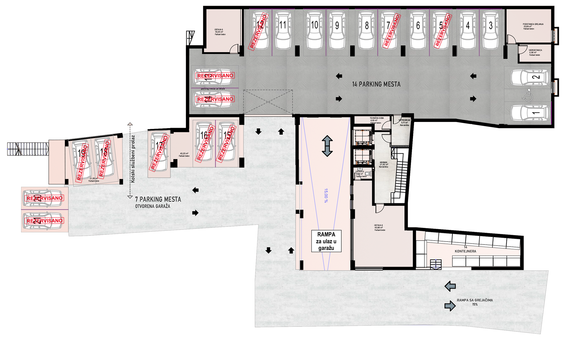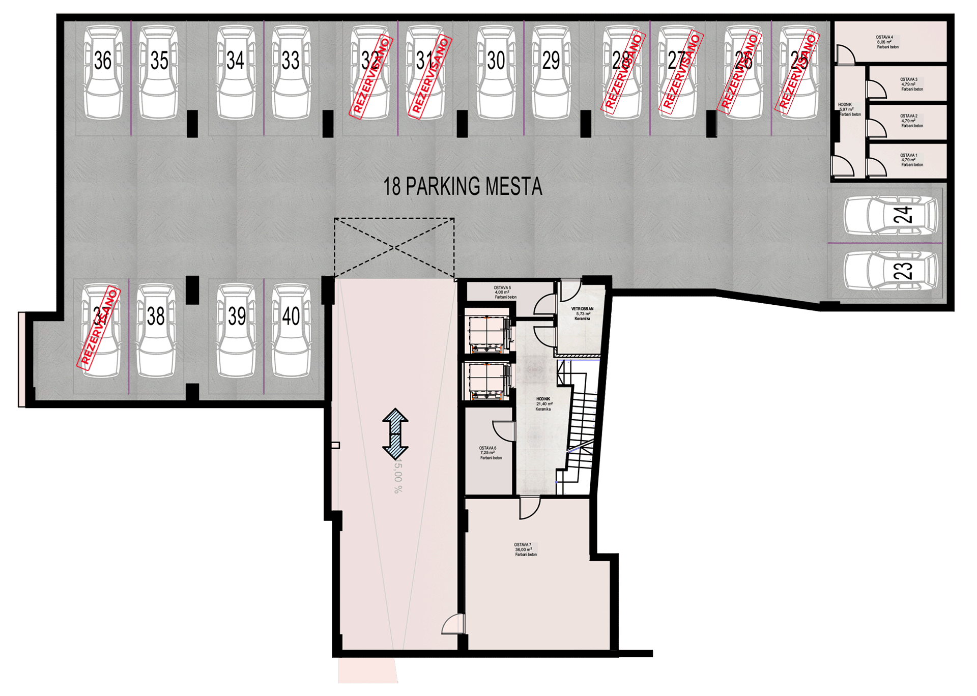 Napravljeno je ukupno 40 parkig mesta raspoređenih na dva nivoa unutar zgrade.